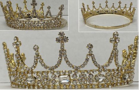 Crafted with clear Austrian crystals and set on gold tone metal, the coronet measures 3 inches in height by 7 inches in width, includes an adjustable headband.