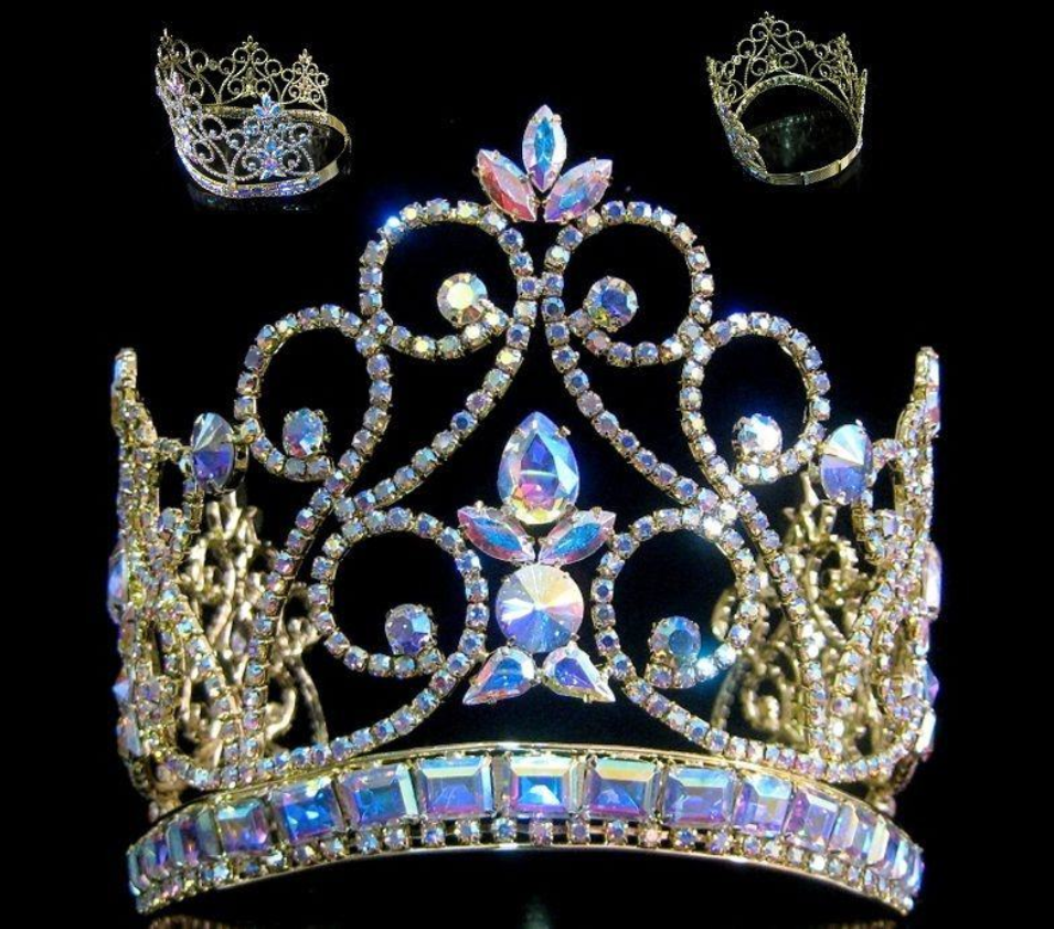 One of the most beautiful aurora borealis tiaras in our collection, featuring hundreds of round, emerald and oval shaped stones, set on gold tone metal.