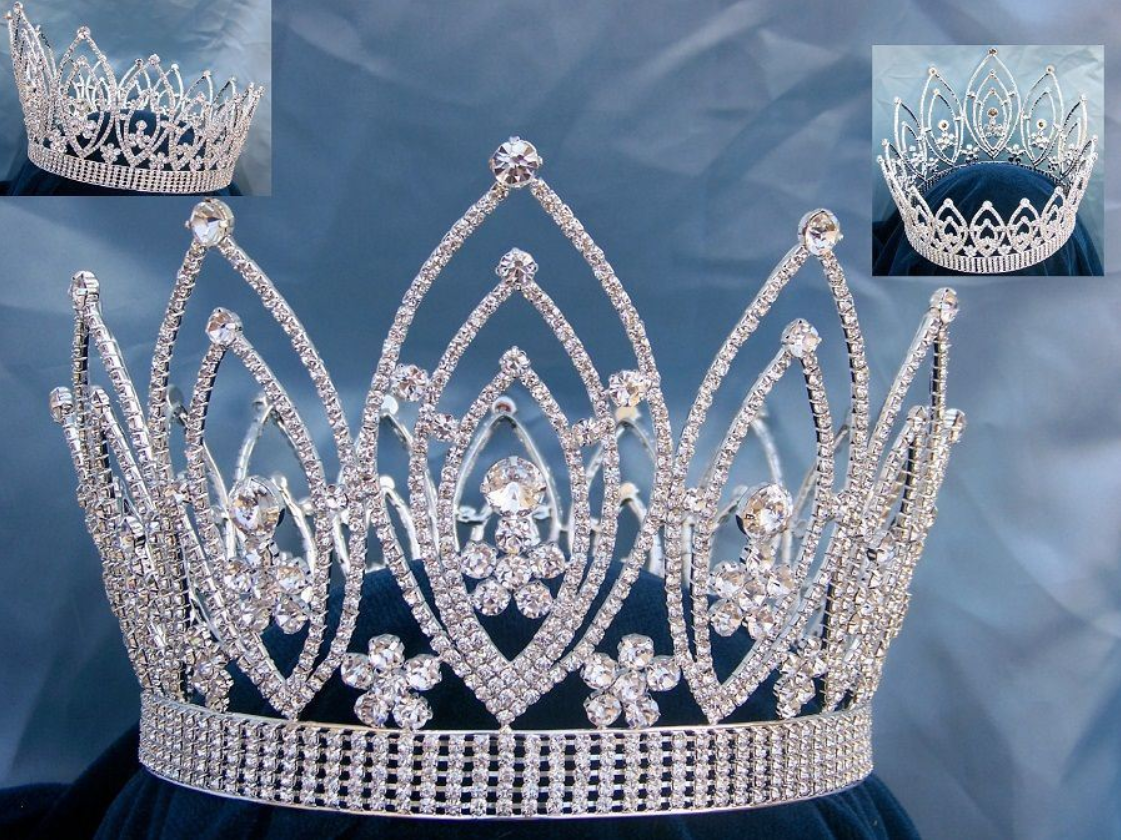 One of our most requested pageant style crowns ever. Majestic and impressive, crafted with brilliant, Swarovski style crystals, set on silver tone metal.