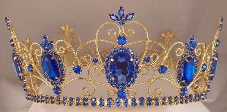 Features hundreds of faux blue sapphires, set on gold tone metal. Ideal as a bridal crown or for use in a beauty pageant.