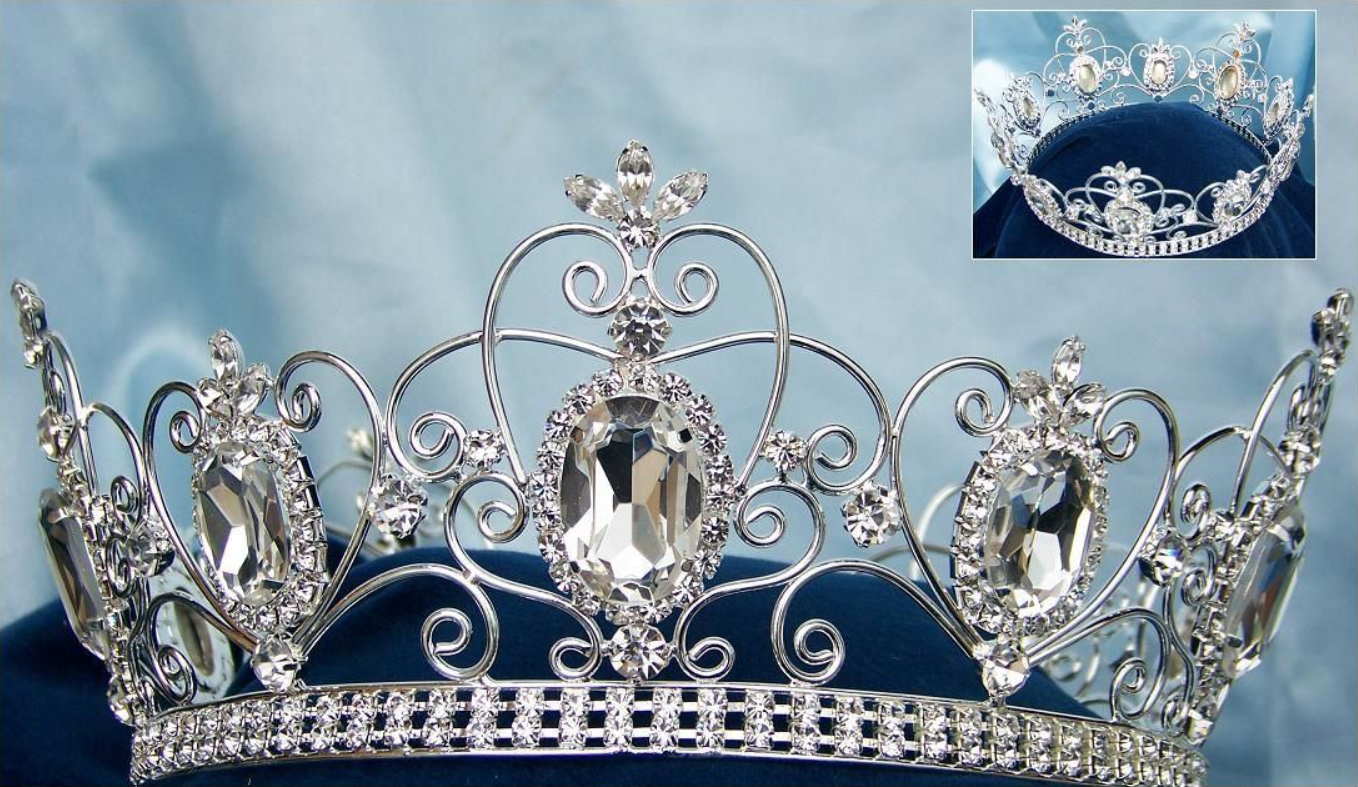 A beautiful, European style crown, fit for royalty. Handcrafted with the finest, imported Austrian clear crystals, the crown measures 3 1/2 inches in height by 7 inches in width, set on silver tone metal. Ideal bridal crown, fit for a would be princess!