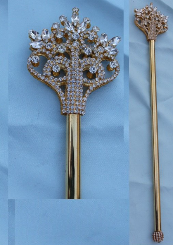 Your prom or debutante ensemble will take on a most royal look when you hold this beautiful scepter in your hands. Top measures 4 inches wide by 5 inches in height. The staph from top to bottom, measures 22 inches in length.